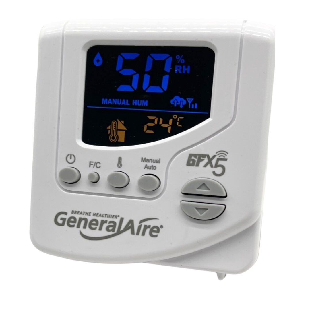 GeneralAire’s new Wi-Fi capable humidistat features all the benefits of the GFX4, with an upgraded software and connectivity to our brand new GeneralAire app. The GFX5 is a universal Wi-Fi technology device. It can be used on any brand/model of humidifier, and replace a standard non-Wi-Fi Manual or Automatic Humidistat. This includes units from Aprilaire, Condair, Honeywell, Nortec among many others.